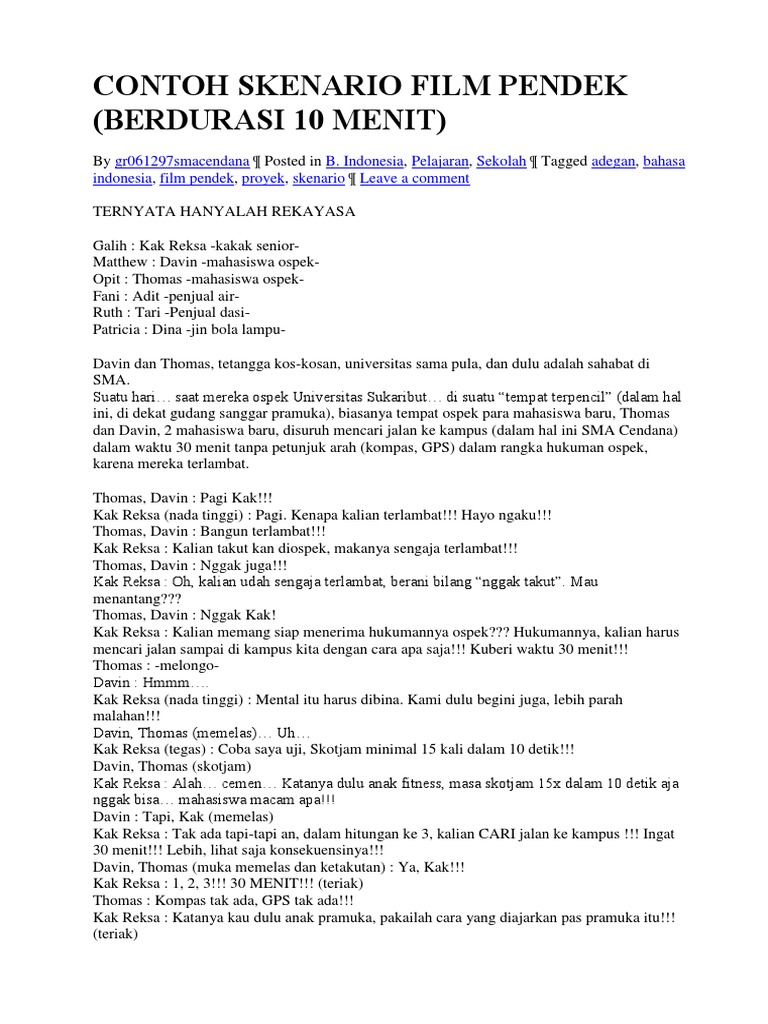 Contoh naskah film pendek motivasi komedi lucu fiksi sedih sekolah dan keluarga diulas dalam tulisan singkat ini. Contoh naskah film pendek motivasi komedi lucu fiksi sedih sekolah dan. Naskah film pendek mencari masa depan oleh.